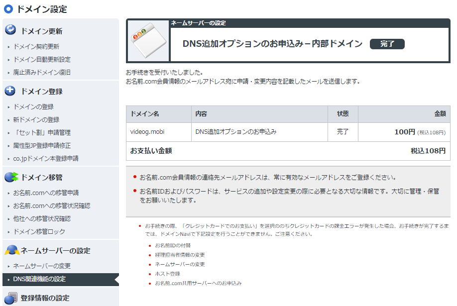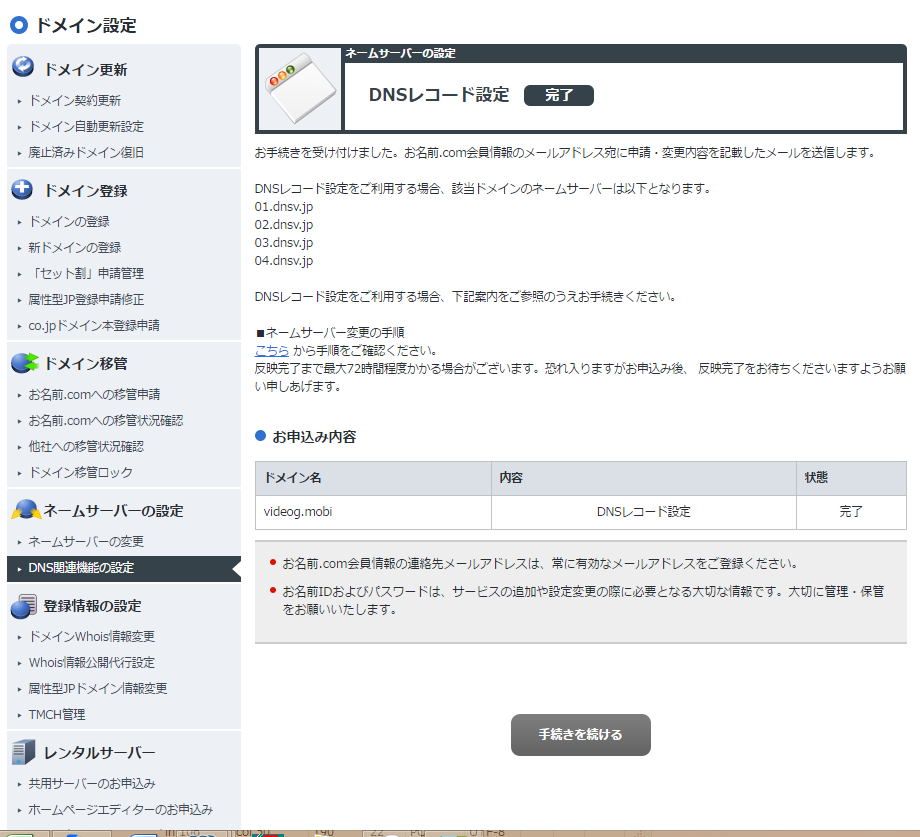 終了です。しばらくするとDNSが反映され利用出来る様になります。